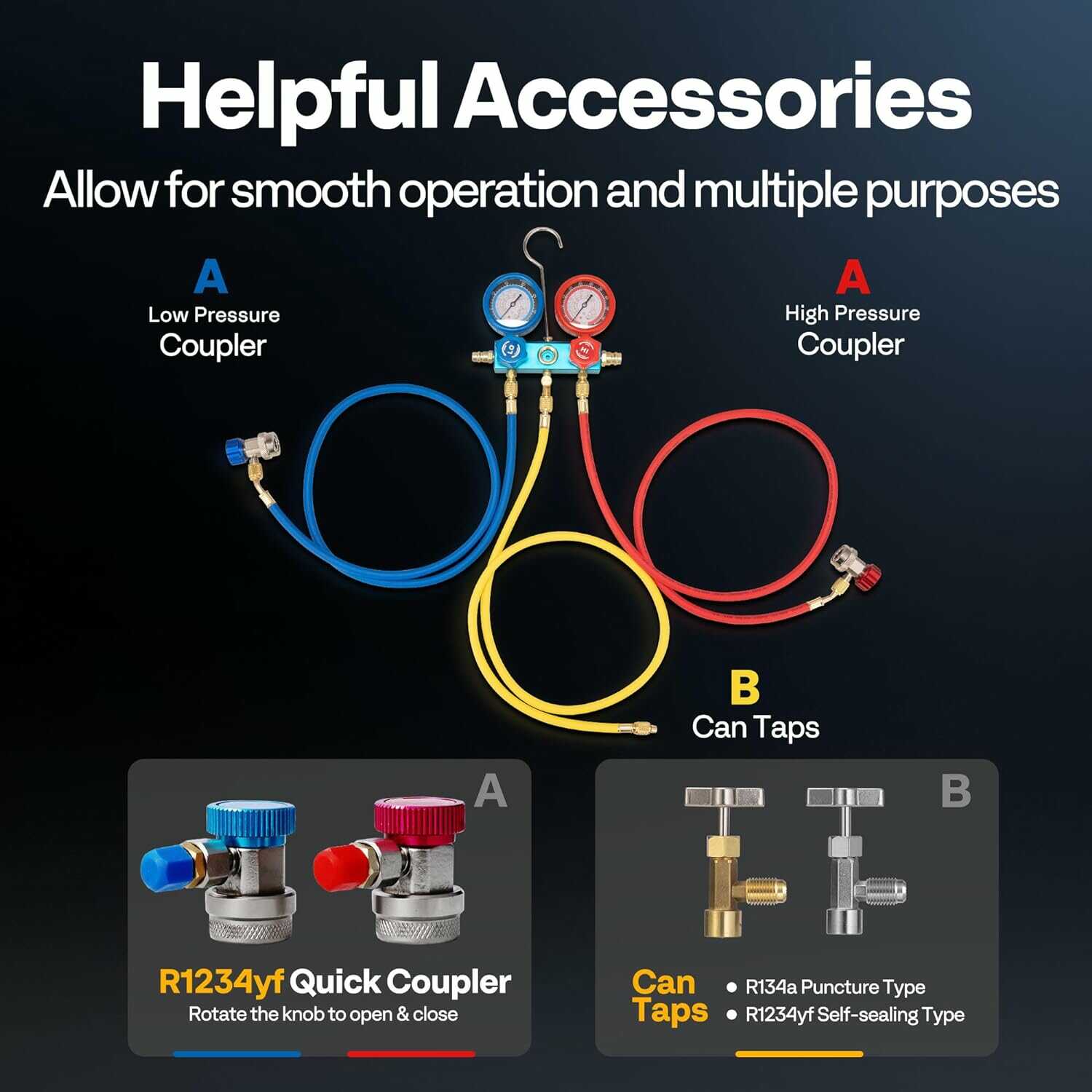 Pakage Include | Can Tap x 2,1/4’’ male to 5/16’’ female adapter x 2,R134a to R1234yf adapter x 2,R1234yf Quick Coupler x 2,Oil (330ml) x 1 |