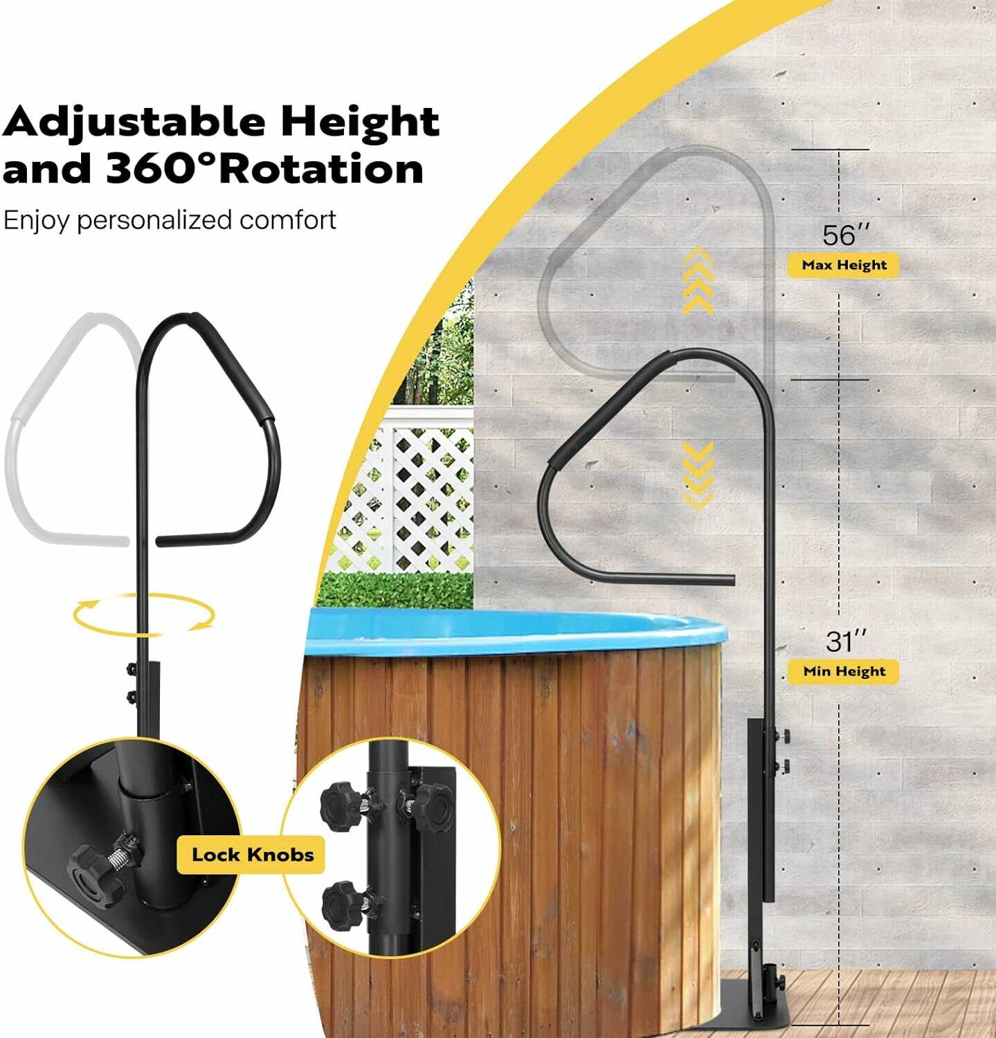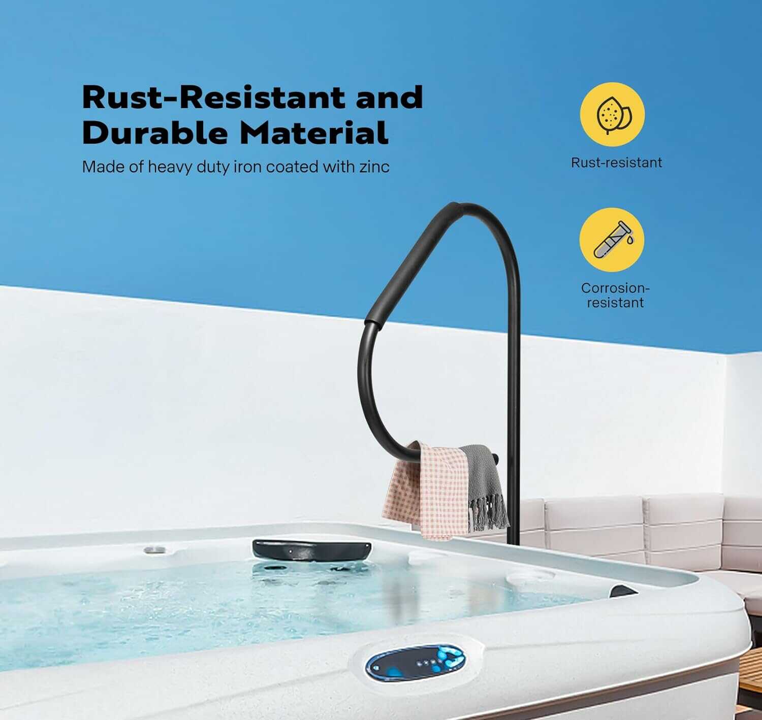 Upgrade your hot tub experience with our exclusive hot tub handrail. It is made of galvanized iron, ensuring rust resistance and durability. Its stable structure, adjustable height, and rubber grip design ensure safety and provide convenience for entering and exiting the hot tub.