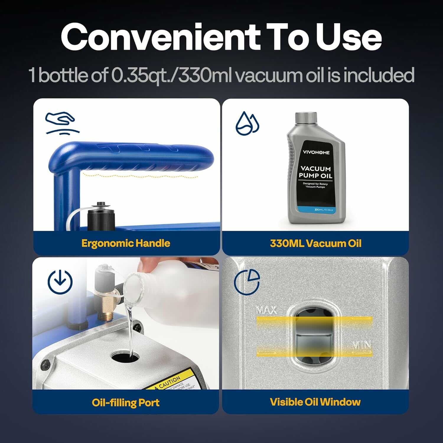 Package Included | 1 x 1/4 HP 3.5 CFM Vacuum Pump, 1 x 330ml Bottle of Oil, 1 x Manual Instruction | 1 x 1/2 HP 5 CFM Vacuum Pump, 2 x Bottle of Oil, 1 x Manual Instruction |
